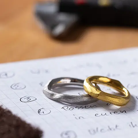 Noch ein Tipp: Es ist wichtig, dass die Ringe in der Größe geändert werden können. Der Körper verändert sich im Laufe des Lebens und die Wahrscheinlichkeit, dass ein Ring irgendwann angepasst werden muss, ist sehr hoch. Das funktioniert nicht mit jedem Material, und auch nur mit einer gewissen Materialstärke. Lasst euch gut beraten, damit ihr lebenslang Freude an den Ringen habt.