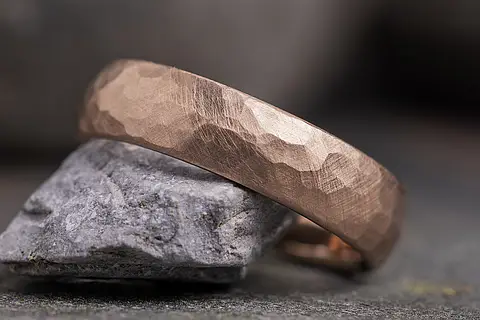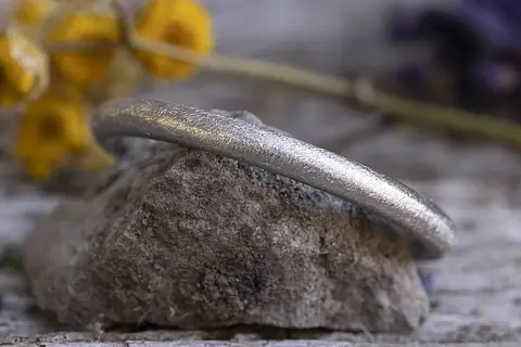Ein Ehering mit einer gehämmerten Oberfläche. Die zarte Struktur bricht das Licht ganz leicht, sodass der Ring samtig schimmert. Jeder Ring wird von Hand gearbeitet, so entsteht jedes Mal eine neue, unvergleichbare Oberfläche.